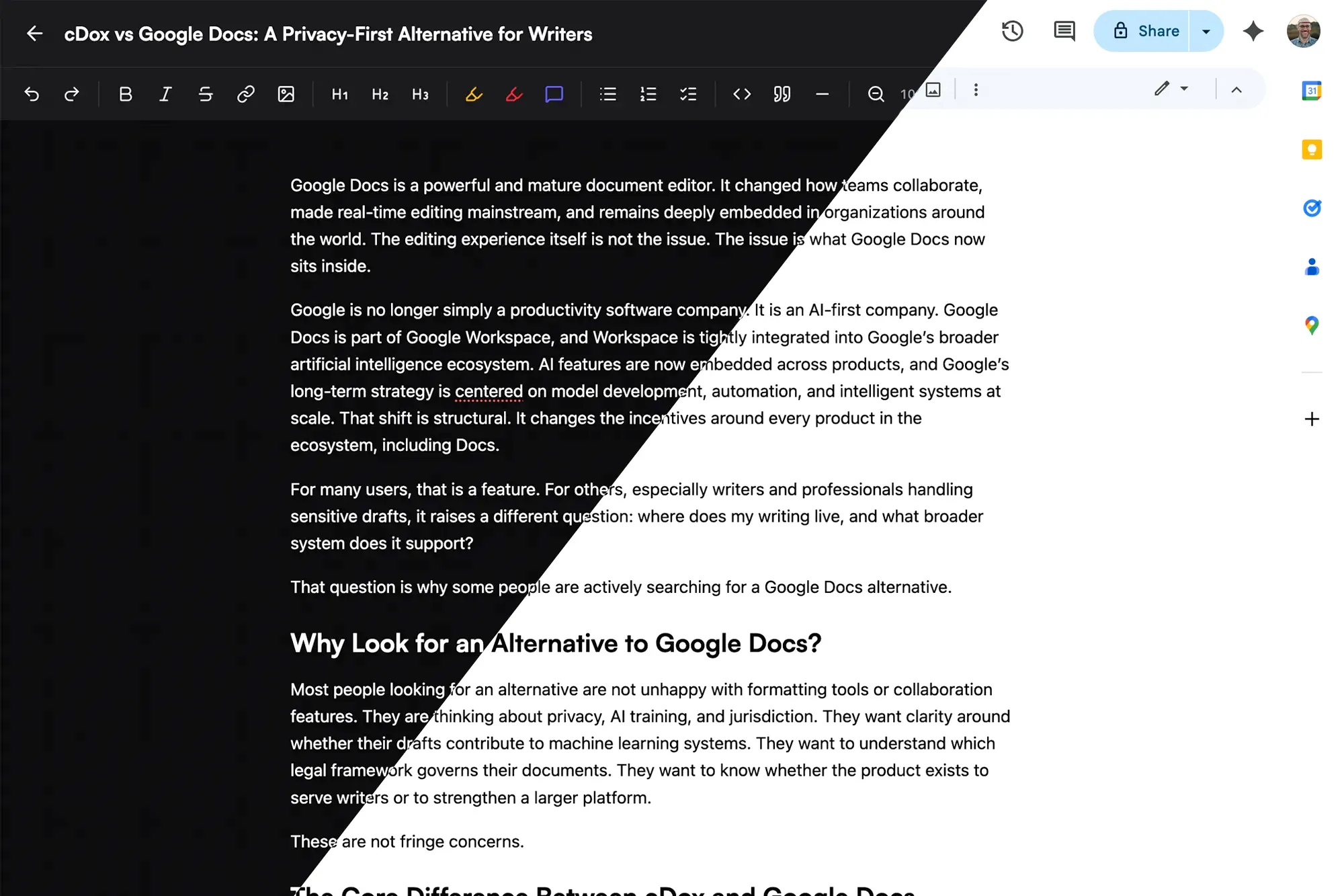 This difference in structure leads to a difference in priorities. Google optimizes for scale and AI integration. cDox optimizes for sovereignty, clarity, and focused writing.